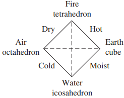 이 5개의 정다면체는 몇 세기에 걸쳐 사람들의 관심을 끌었던 우주도형 가운데 엠페도클레스의 4원소와 관련이 있었다.