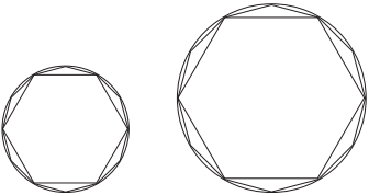 원 \(c\)와 원 \(C\)안에 넓이가 각각 \(p_{n},\,P_{n}\)인 정\(n\)다각형을 내접시키고, 다각형의 바깥쪽과 원의 안쪽에 있는 틈새를 생각한다.