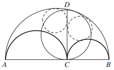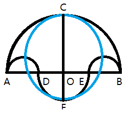 선분 \(AB,\,AD,\,DE\)와 \(EB\)를 지름으로 하는 네 개의 반원을 그리는데 이때 \(AD=EB\)이다. 그러면 소금창고로 둘러쌍니 도형의 넓이(반원만으로 둘러싸여 있다)는 그 도형의 대칭축 \(FOC\)를 지름으로 하는 원의 넓이와 같다.