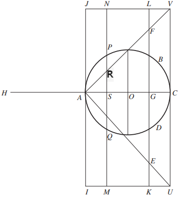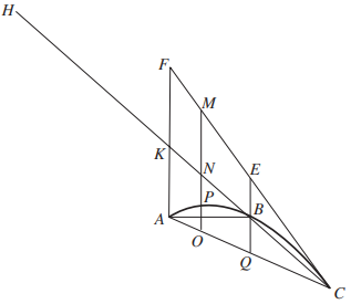 그런데 여기서 \(OP\)와 똑같은 선분이 \(H\)(여기서 \(HK=KC\))에 있다면, 이것은 선분 \(OM\)과 \(K\)를 받침점으로 하여 균형을 이룰 것이다. 따라서 포물선 조각의 중심이 \(H\)와 일치하는 곳에 있을 때 그것은 정확히 삼각형 \(AFC\)와 균형을 이룰 것이다. 그리고 이때 삼각형의 중심은 \(KC\)위에 \(K\)에서 \(C\)쪽으로 \(\frac{1}{3}\)인 곳에 있다. 이상에서 포물선의 조각의 넓이는 삼각형 \(AFC\)의 넓이의 \(\frac{1}{3}\), 결국 포물선 내접 삼각형 \(ABC\)넓이의 \(\frac{4}{3}\)인 것을 알 수 있다(이것은 지레의 원리와 포물선의 성질에서 알 수 있다). 포물선의 성질로부터$$MO:OP=CA:AD=CK:KN=HK:KN\,(\because\,CK=HK)$$이므로 따라서 \(MO:OP=HK:KN\)이고 \(OP\cdot HK=MO\cdot KN\)이다.