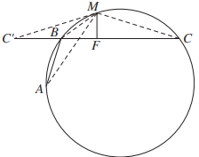 원 위의 점 \(B\)에서 꺾인 현 \(AB\)와 \(BC\,(AB\neq BC)\)가 있고, \(M\)을 호 \(ABC\)의 중점, 긴 현에 내린 수선의 발을 \(F\)라 하면, \(F\)는 꺾인 현 \(ABC\)의 중점이 된다는 것이다.