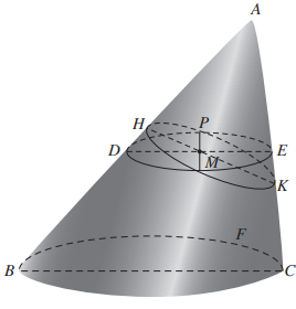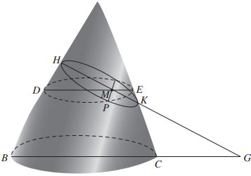 먼저 \(ABC\)를 기운 원뿔의 삼각형 단면으로 하고, \(P\)를 원뿔의 단면 \(HPK\)위의 임의의 점으로 한다. 다음에 \(HK\)를 연장하여 \(BC\)의 연장선과 만나는 점을 \(G\)라 하고, \(P\)를 지나는 수평면을 생각하면, 그것은 원뿔을 원 \(DPE\)로 자르고 평면 \(HPK\)를 선분 \(PM\)으로 자른다. 그리고 선분 \(PM\)에 수직이 되도록 원 \(DPE\)의 지름 \(DME\)를 긋는다. 그러면 \(\triangle HDM\)과 \(\triangle HBG\)는 서로 닮음이므로 \(\frac{DM}{HM}=\frac{BG}{HG}\)를 얻고, 또 \(\triangle MEK\)와 \(\triangle KCG\)가 닮음이므로 \(\frac{ME}{MK}=\frac{CG}{KG}\)를 얻는다. 그런데 원의 성질로부터 \(PM^{2}=DM\cdot ME\)이므로 따라서 \(PM^{2}=\frac{HM\cdot BC}{HG}\cdot\frac{MK\cdot CG}{KG}\)를 얻는다.