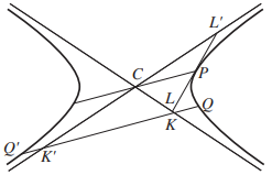 보기를 들면 점 \(C\)를 중심으로 하는 쌍곡선 위의 임의의 점을 \(P\)라 하고, \(P\)에서 그은 접선이 점근선과 만나는 점을 \(L\)과 \(L'\)이라 하면 \(PL=PL'\)이고(명제 8, 10), 또 \(CP\)에 평행한 임의의 현 \(QQ'\)이 점근선과 만나는 점을 \(K,\,K'\)라 하면 \(QK=Q'K'\)과 \(QK\cdot QK'=CP^{2}\)이 된다(명제 11, 16).