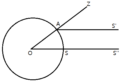 그리고 위 그림에서 각 \(S'AZ\)와 \(S''OZ\)가 같다는 것으로부터 지구의 둘레는 시에네와 알렉산드리아 사이의 거리의 50배가 되는 것은 분명하다. 따라서 지구의 둘레는 250,000스타디온(1 스타디온: 약 161m) 이므로 \(40,250km\)이다(뒤에 이 값은 250,000 스타디온으로 수정되는데 \(1^{\circ}\)를 700스타디온으로 사용하게 된 때문일 것이다.).