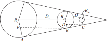 거기서 \(R_{s},\,R_{e},\,R_{m}\)을 각각 태양, 지구, 달의 반지름, \(D_{s},\,D_{m}\)을 각각 지구에서 태양과 달 까지의 거리라 하면 삼각형 \(BCD\)와 \(ABE\)가 닮음꼴이므로 비 \(\frac{R_{e}-2R_{m}}{R_{s}-R_{e}}=\frac{D_{m}}{D_{s}}\)을 얻는다. 그리고 이 등식에서 \(D_{s}\approx19D_{m}\), \(R_{s}\approx19R_{m}\)으로 바꾸면 등식 \(\frac{R_{e}-2R_{m}}{19R_{m}-R_{e}}=\frac{1}{19}\), 곧 \(R_{m}=\frac{20}{57}R_{e}\)를 얻는다. 여기서 아리스타르쿠스의 실제 계산은 상당히 단순화된 것이고, 실제로 위보다 더 면밀하게 추론해 다음의 부등식을 얻었다.$$\frac{108}{43}<\frac{R_{e}}{R_{m}}<\frac{60}{19},\,\frac{19}{3}<\frac{R_{s}}{R_{e}}<\frac{43}{6}$$