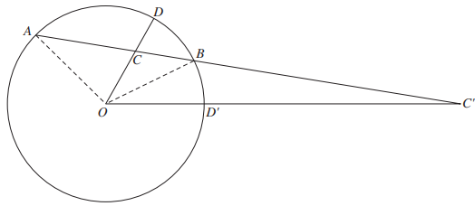 2. 현 \(AB\)와 반지름 \(OD'\)의 연장선이 원 밖의 점 \(C'\)에서 만자면 \(\frac{AC'}{BC'}=\frac{\sin\widehat{AD'}}{\sin\widehat{BD'}}\)이다.