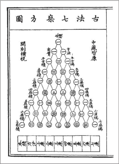 1100년 무렵의 중국의 수학책 중 이항계수를 그림으로 나타내는 방법을 언급한 것이 있기 때문에 산술삼각형은 중국에서 그 무렵에 등장했다고 보아도 된다. 실제로 중국에서는 이항계수를 근의 거듭제곱근의 풀이에 사용했다.