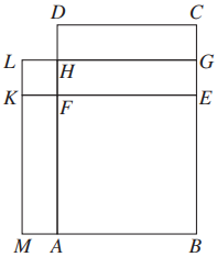 직사각형 \(ABCD\)와 넓이가 같은 정사각형을 만들기 위해 \(AF=AB=BE=CD\)가 되도록 긴 쪽의 변을 짧은 쪽의 변으로 나누고, 선분 \(CE\)와 \(DF\)로 이등분하는 선분 \(HG\)를 긋는다.