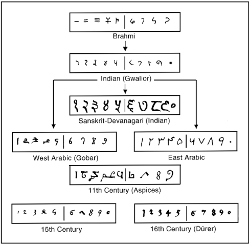 이 두 개의 기수법에 내재하는 법칙이 똑같다는 사실과 우리가 사용하는 숫자의 형태가 아라비아에서 유래했을 것이라는 까닭에서 아라비아 숫자라고 하고 있다. 그러나 아라비아 숫자의 배후에 있는 법칙은 인도에서 유래했을 것이다. 그러므로 현대 기수법을 인도 또는 인도아라비아 기수법이라고 하는 것이 더 나을 것이다.