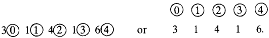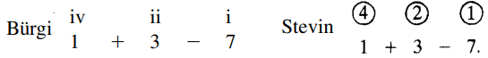 스테빈은 특이하게도 \(\displaystyle\frac{1}{10},\,\frac{1}{100},\,\frac{1}{1000},\,\cdots\)과 같은 것을 정수처럼 다루려고 했다. 그래서 \(\pi\)를 다음과 같이 나타냈다.