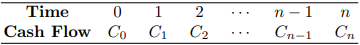 투자의 순현재가(net present value, NPV)는 유입 현금흐름의 현재가와 유출 현금흐름의 현재가치의 차, 즉$$\text{NPV}=C_{0}+C_{1}(1+i)^{-1}+C_{2}(1+i)^{-2}+\cdots+C_{n}(1+i)^{-n}$$이며 여기서 \(i\)는 유력한 이자율(prevailing)이다(보통 초기 현금흐름 \(C_{0}\)는 음수이다). 이 이자율은 투자 위험의 함수이다.