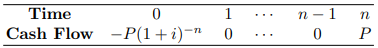 연도 0에 투자하여(그래서 현금이 나가고 따라서 음의 부호가 붙는다), 연도 2에 1,123.60달러를 받는다. 이것을 다음과 같이 시간도표로 나타낸다.
