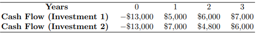 (b) 유력한 이자율이 9%일 때 투자 1과 2의 NPV를 각각 NPV1, NPV2라 하면$$\begin{align*}\text{NPV}1&=-13000+\frac{5000}{1+0.09}+\frac{6000}{(1+0.09)^{2}}+\frac{7000}{(1+0.09^{3}}=2,042.52\$\\ \text{NPV}2&=-13000+\frac{7000}{1+0.09}+\frac{4800}{(1+0.09)^{2}}+\frac{6000}{(1+0.09)^{3}}=2,095.18\$\end{align*}$$이므로 투자 2를 선택한다.