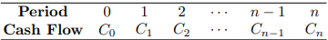 \(n=1\)일 때(그래서 두 개의 현금흐름이 있다) 이 방정식은 \(C_{0}(1+i)+C_{1}=0\)이 되고 \(\displaystyle i=-\frac{C_{1}+C_{0}}{C_{0}}\)이다.