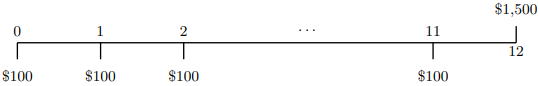 예: 12개우러 동안 매월 초에 케네스는 어떤 지수펀드의 100달러에 해당하는 지분을 구입했다. 12개월째 말에 그의 지분의 가치는 1,500달러였다. 이 때의 내부수익률 \(i_{\text{irr}}\)은?