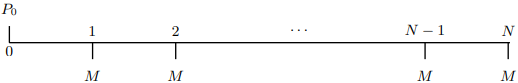(b) \(M=iP_{0}\)이면, \(P_{n}=P_{n+1}\) 즉, 정기상환액=초기 대여금의 이자 이면, 원금잔액은 일정하다.