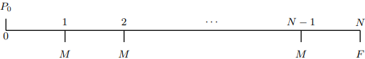 이제 \(F\)가 다음과 같이 주어진다.$$F=P_{N-1}(1+i)=\left\{\left(P_{0}-\frac{M}{i}\right)(1+i)^{N-1}+\frac{M}{i}\right\}(1+i)$$그러므로 마지막 상환액은$$(2)\,F=\left(P_{0}-\frac{M}{i}\right)(1+i)^{N}+M\frac{1+i}{i}$$이다. 직관적으로 \(0<F\leq M\)이라 기대하지만 (1), (2), \(M>iP_{0}\)라는 사실에서 \(0<F\leq M\)이 성립한다.