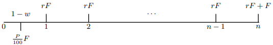 지금까지는 이자 지급일의 채권 가격을 계산했다. 이제 실제로 자주 생기는 경우인 이자기간 도중에 채권이 매매되는 경우를 보자. 구매자 입장에서 다음 이자가 구매자에게는 첫 이자이고 \(n\)번의 이자 지급기간이 남았다고 하자. 채권가격이 계산되는 시점에 남은 첫 이자 지급기간의 비율을 \(w(0<w<1)\)라 하자. 해결해야 할 문제가 두 가지 있다.