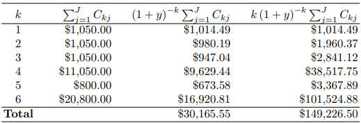 이 표로부터 듀레이션이 \(\displaystyle\frac{149226.50}{230165.55}=2.473\)이 됨을 알 수 있고, 앞의 예와 같은 값이다.