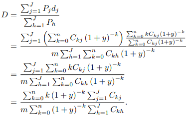 포트폴리오사 \(1\leq j\leq J\)에 대해 각각 만기 \(\displaystyle\frac{n_{j}}{m}\), 가격 \(P_{j}\), 듀레이션 \(d_{j}\)인 \(J\)개의 채권으로 구성되었다고 하자. 각 채권에 대해 기간당 수익률은 \(y\)이고, 연간 이자 지급횟수는 \(m\)이다.
