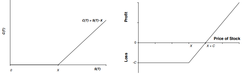 옵션 보유자가 옵션을 행사하고 곧바로 주식을 매각하면 보유자는 \(S(t)-X\)를 얻는다. 그런데 \(S(t)-X\leq C(t)\)이므로 만기일 이전에 콜옵션을 행사하는 것은 보유자에게 이득이 되지 않는다. 다음은 만기일(\(t=T\))의 주당 계약가격과 주당 수익이다(왼쪽: 주당 계약가격, 오른쪽: 주당 수익).$$C(T)=\begin{cases}0&\,(S(T)\leq X)\\S(T)-X&\,(S(T)>X)\end{cases},\,C(T)-C=\begin{cases}-C&\,(S(T)\leq X)\\S(T)-X-C&\,(S(T)>X)\end{cases}$$