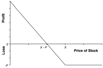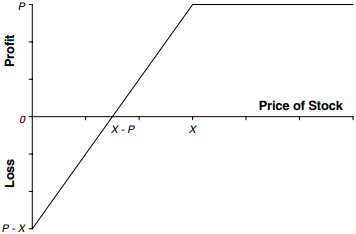 일반적으로 주당수익은 다음과 같고$$\begin{cases}C&\,(S(T)\leq X)\\X-S(T)-C&\,(S(T)>X)\end{cases}$$ 여기서 \(C\)는 주당 가격, \(X\)는 주당 행사가격이다.