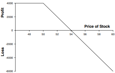 주식이 주당 54달러를 넘어 종료되면 톰은 손해를 보게 되고, 그 잠재적 손실에는 한계가 없다. 만기일에 주식이 주당 50달러보다 높으면 풋옵션은 행사되지 않는다.