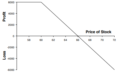 만기일에 D회사의 주가가 행사가격 60달러 이하로 종료되면 존은 전체 프리미엄을 갖게 된다. 주가가 만기일에 60달러보다 높아지면 존은 프리미엄을 갖게되나 \(1\$\times10\times100\times(S(T)-60)\)을 잃게 된다. 따라서 그의 손익분기점은 66달러이다. \(S(T)>66\)이면 그는 순손실 \(1000(S(T)-66)\)을 입게 된다. 그러므로 그가 지닌 잠재적 손실 위험은 한계가 없다.