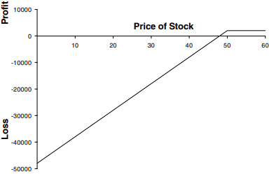 톰의 최대 수익은 만기일에 주식이 50달러 이하가 될 때이다. 만기일에 주식이 50달러 이하가 되면 풋옵션이 행사되고 톰은 주식을 구매해야 하므로 \(10\times50\$\times100=50,000\$\)를 지불한다. 이 주식들로 그는 공매도 포지션을 감