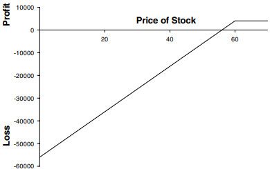 이 경우 톰은 주식을 공매도했기 때문에 52달러를 넘는 1달러마다 \(10\times1\$\times100=1,000\)달러를 잃게 된다. 톰의 손익분기점은 54달러 이고, 이 점에서 톰은 \(10\times54\$\times100=54,000\)달러를 공매도 포지션을 감당하기 위해 지불하므로 공매도 해서 받은 금액과 풋옵션 발행으로 받은 금액의 합 \(52,000\$+2,000\$=54,000\$\)와 상쇄된다.