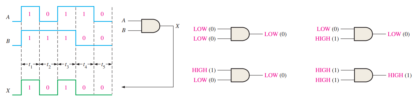 왼쪽의 위의 그림은 AND게이트의 고유 기호이고, 아래쪽 그림은 사각형 모양의 AND게이트 기호이다. AND게이트는 A, B입력이 모두 1인 경우에만 1이 출력되고 나머지의 경우는 전부 0이 출력된다. AND 게이트에 대한 불 식은 \(X=A\cdot B\)(AND)이다.