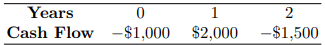 누군가에게 지금 1,000달러와 2년 후에 1,500달러를 주고 대신 1년 후 2,000달러를 받는 것이다.$$-1000(1+i_{\text{arr}})^{2}+2000(1+i_{\text{arr}})-1500=0$$이고 정리하면 \(2i_{\text{arr}}^{2}+1=0\)이므로 따라서 이 거래에는 IRR이 없다.